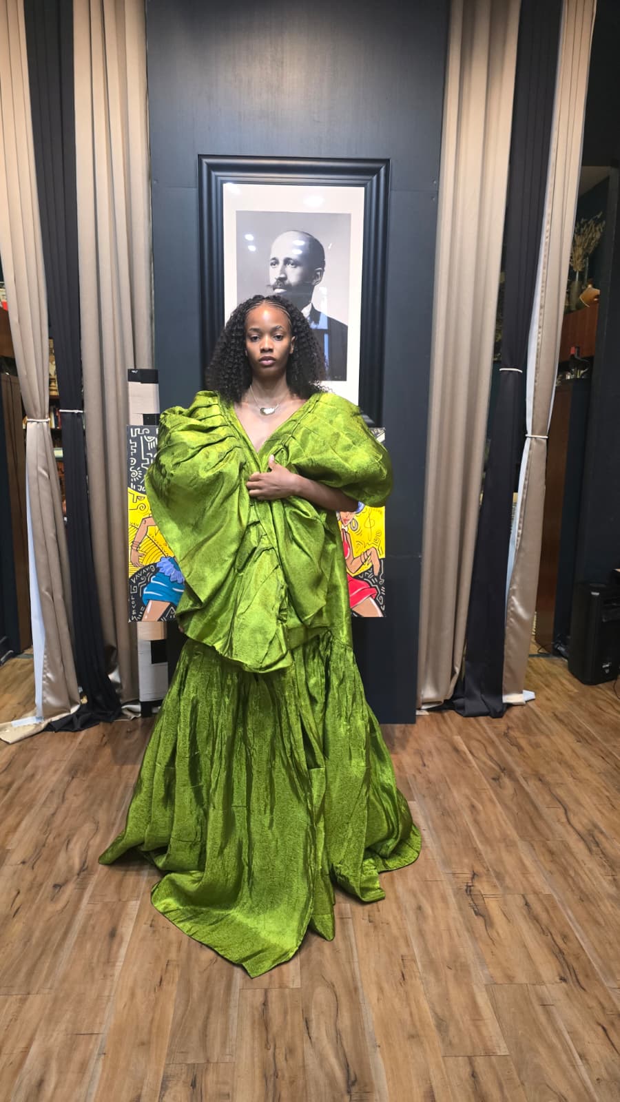 The Ageless Gown is pure fashion sculpture. Crafted in a breathtaking, vibrant Chartreuse or Lime Green textured silk blend, this piece features a dramatically draped, voluminous bodice that mimics a grand cape or exaggerated puffed sleeves. The skirt flows out in a structured, textured maxi-length, creating a powerful silhouette that is both timeless and strikingly modern. This gown is reserved for the woman who intends to leave a lasting, unforgettable impression.