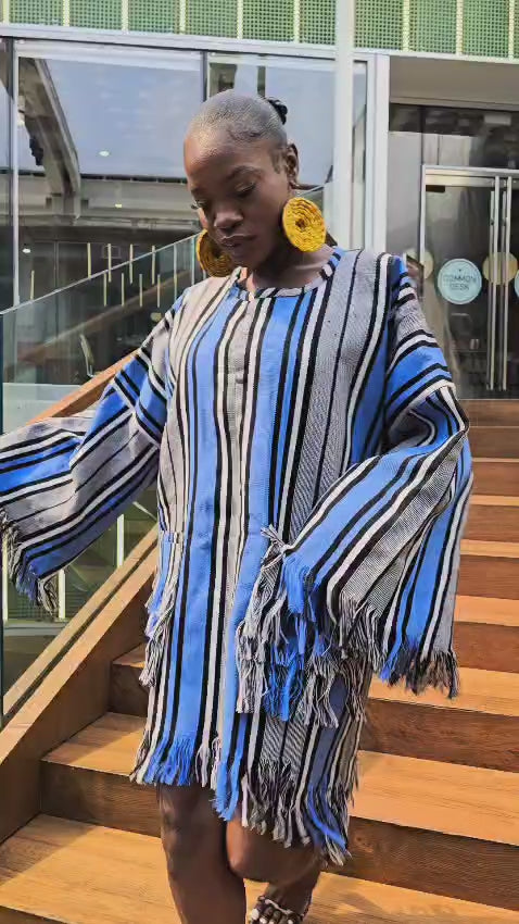 The Genevieve Dress is an homage to African textile mastery, designed for the woman who values heritage and luxury. Crafted from a structured, Kente/Aso Oke-inspired woven textile, it features elegant vertical stripes in serene shades of blue and grey. The clean, tunic silhouette is polished, while the playful fringe detail on the sleeves and hem adds an artistic, modern edge. It’s a wearable masterpiece for the professional setting and beyond.
