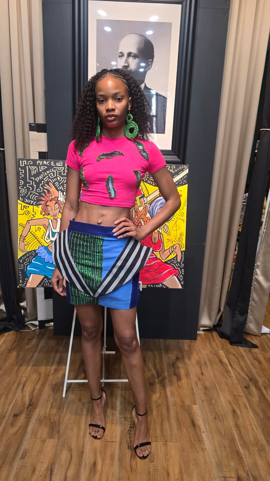 Make an unforgettable entrance with the Oumu Flank Skirt. This contemporary mini features a brilliant fusion of colour and texture, anchored by a bold, tailored design. The unique curved 'flank' panels introduce a modern, architectural structure to the silhouette, while the striking African-inspired prints add depth and cultural flair. It's a statement piece designed for the confident woman who appreciates fashion as art.