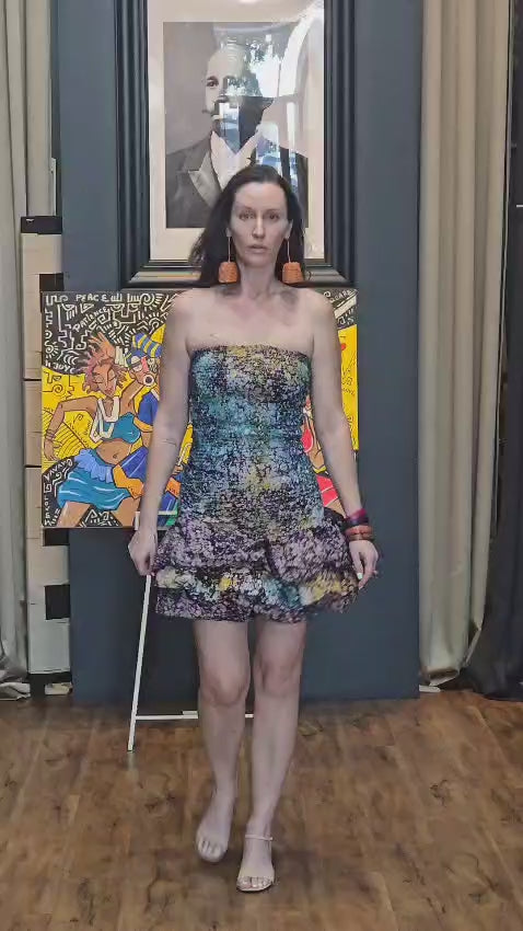 Introducing the Sade Dress, your essential passport for resort elegance. Featuring a joyful, hand-dyed inspired print, this dress captures the spirit of [Insert Region/Inspiration, e.g., West African Tie-Dye] artistry. The beautiful shirred bodice ensures a flawless fit, while the playful 'Frufru' ruffle hem brings irresistible movement and energy to every step you take.