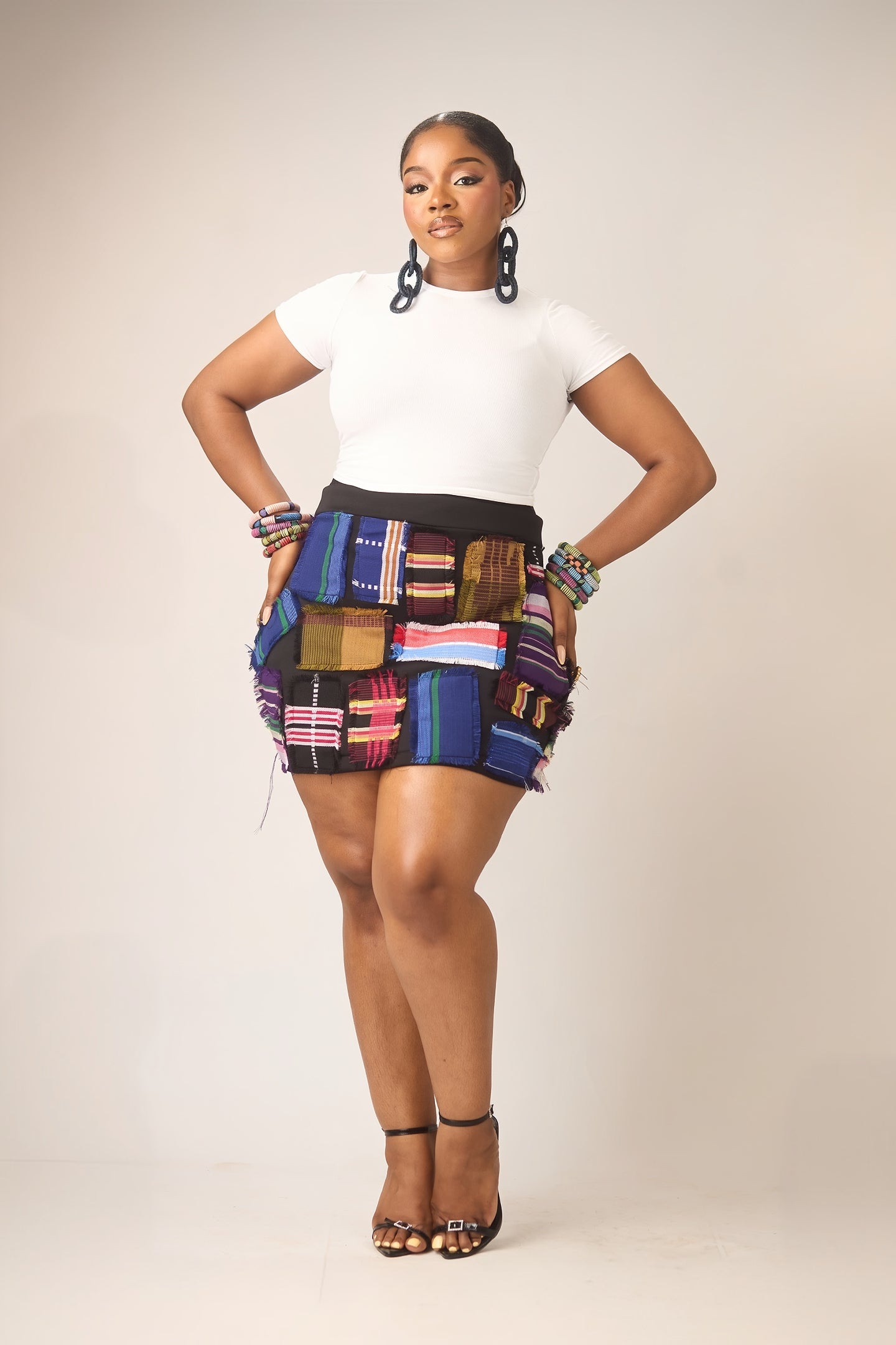 Celebrate colour and texture with the Tiwa Patchwork Skirt. This unique piece is a wearable canvas, meticulously crafted from a mosaic of vibrant African-inspired woven fabrics and textures. The raw-edge patchwork construction gives it a tactile, artisanal feel, while the flattering mini-skirt silhouette makes it perfect for social gatherings and vibrant weekend adventures. Wear it and carry a piece of rich textile heritage with you.